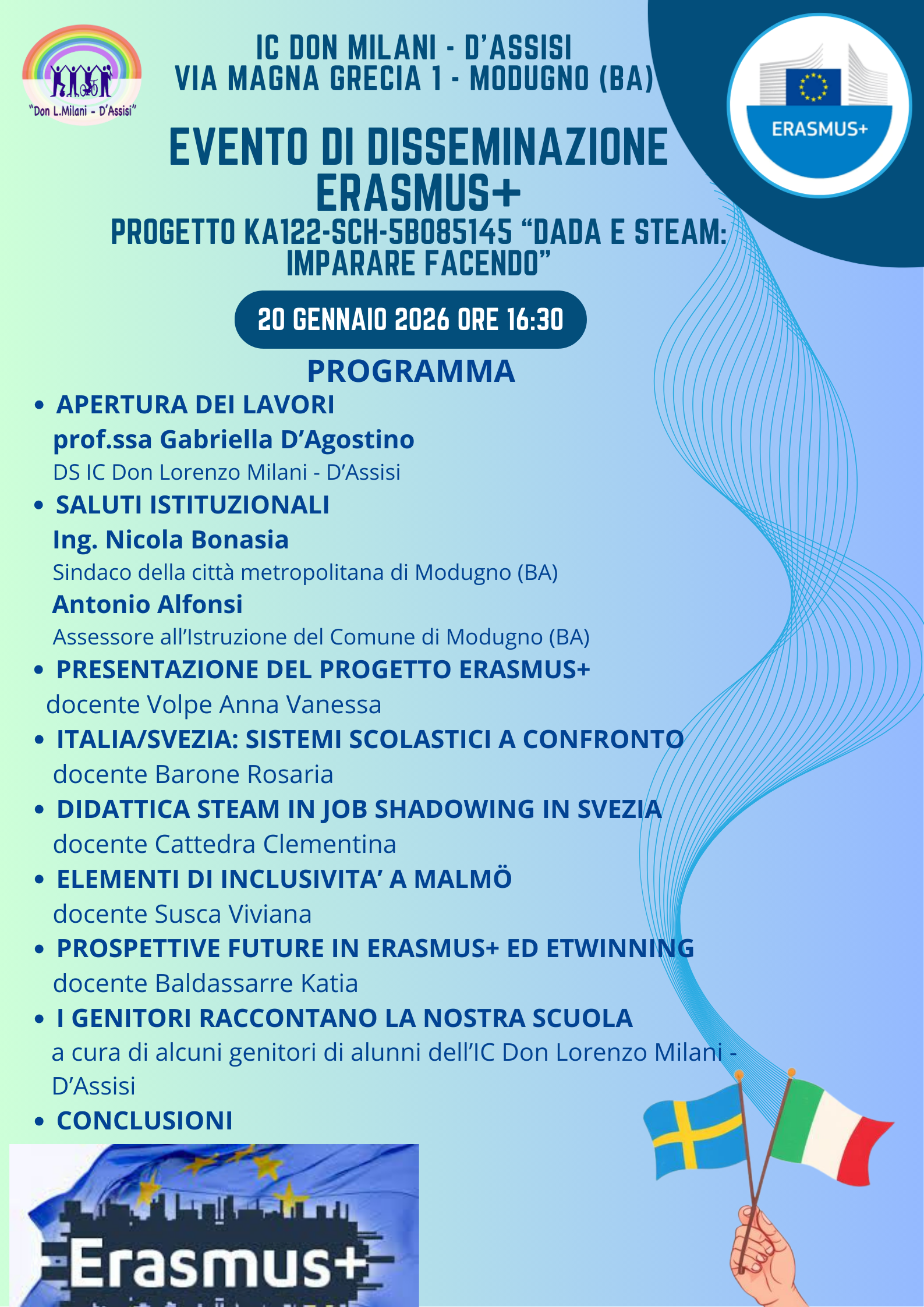 Martedi 20/01/2026 presso l'auditorium del plesso Don Milani, tutta la comunità scolastica è invitata a partecipare all'evento di disseminazione Erasmus+