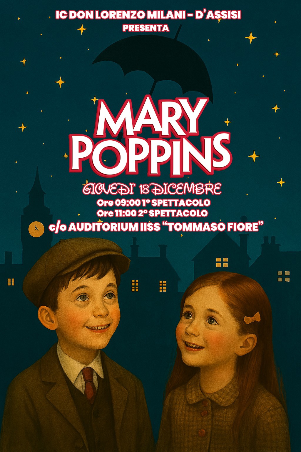 Gli alunni cinquenni della Scuola dell’Infanzia, le classi 5^ della Scuola Primaria e gli alunni del Coro dell’Intervallo della Scuola Secondaria presentano il musical Mary Poppins, giovedi 18 Dicembre 2025 c/o l’IISS “Tommaso Fiore” a Modugno. Lo spettacolo sarà articolato in due turni: